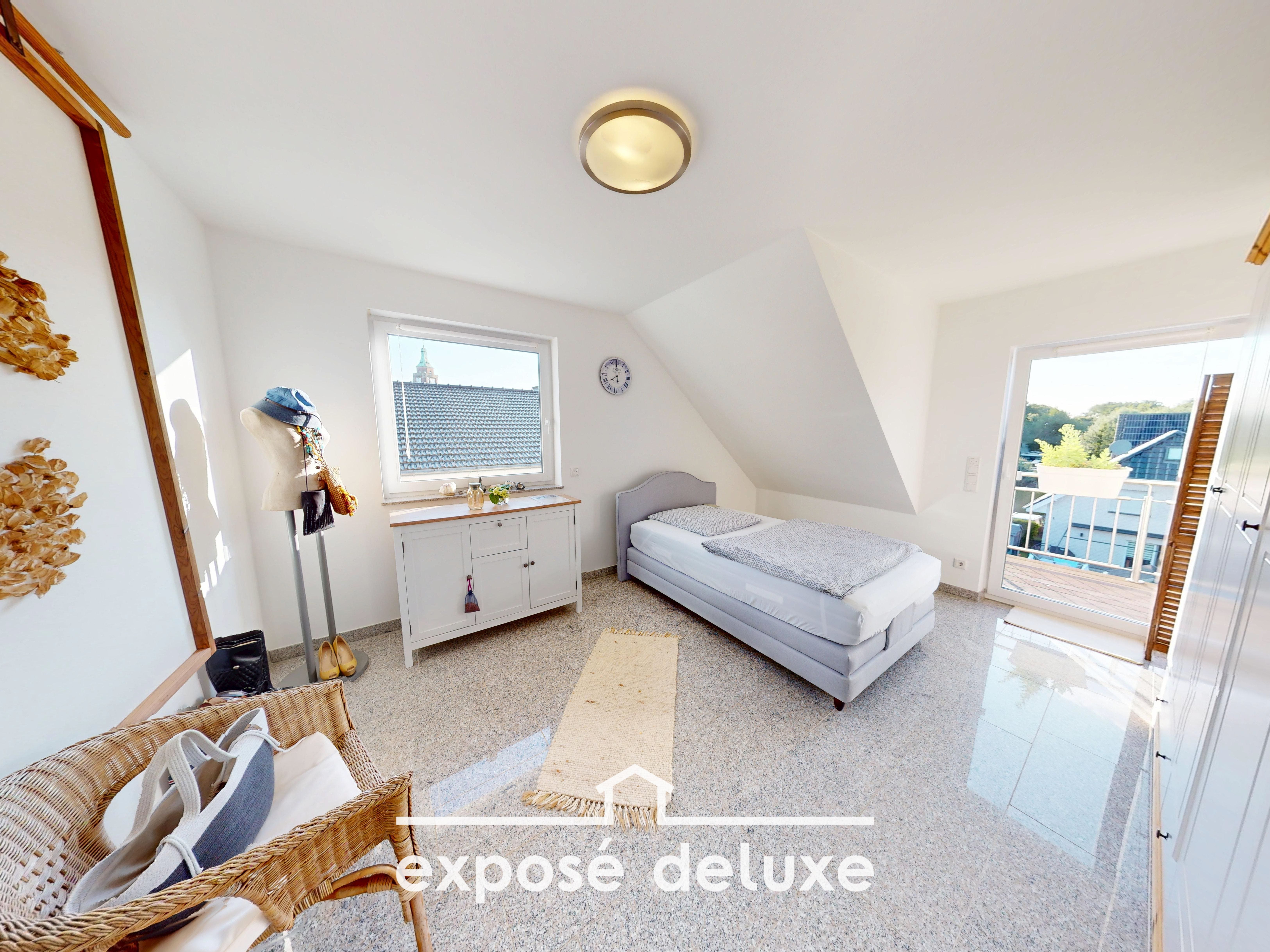 Im Dachgeschoss befindet sich das private Rückzugsrefugium: Ein Schlafzimmer mit Balkonzugang und ein hochwertiges Bad mit Wanne, Dusche und Doppelwaschbecken. Das Badezimmer besticht ebenfalls mit einen eigenen Zugang zum Balkon, von dem aus Sie den herrlichen Fernblick auf Ihre grüne Umgebung genießen. Ergänzt wird die Etage durch ein großzügiges Studiozimmer, das sich problemlos auch in zwei Kinderzimmer aufteilen lässt.
